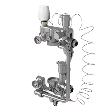 Узел смесительный предназначен для понижения температуры теплоносителя в основном контуре отопления до уровня необходимого во вторичном контуре. Узел смесительный в основном применяется при монтаже водяного напольного отопления. Узел адаптирован для совместного применения с коллекторами с межосевым расстоянием 200 мм
